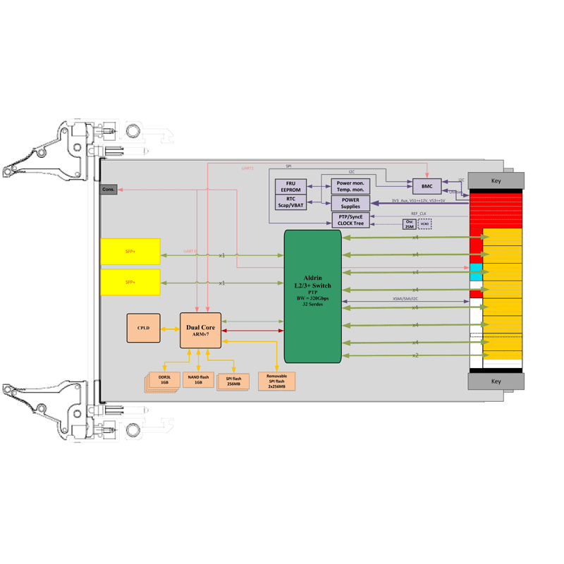 The ComEth4582a is a 3U VPX 10/40 Gigabit Ethernet switch, based on a new generation of multi-layer Ethernet matrix for high speed embedded interconnect applications requiring low-power 10G and 40G connectivity.
