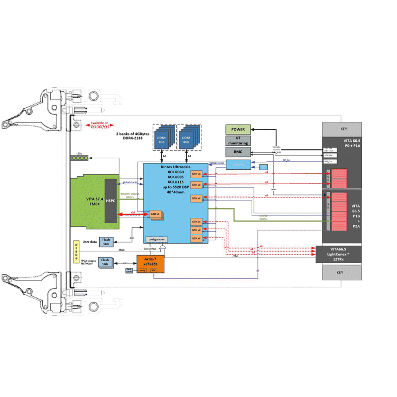 The AMD Kintex™ UltraScale™ FPGA provides a better performance/power consumption ratio compared to previous FPGAs, and makes the IC-FEP-VPX3f the perfect solution for applications requiring DSP intensive processing in a 3U VPX form factor.