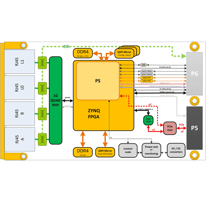 • 4 * Ethernet 1G BASE-T ports on RJ45 through Q-PHY connected to PL (exclusive with rear option)