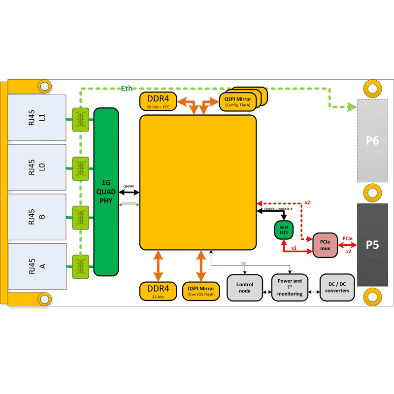 The IC-RBP-XMCa XMC module runs as a «black box». It adds a dual attached Ethernet redundancy capability to Single Board Computers or systems in high availability applications.